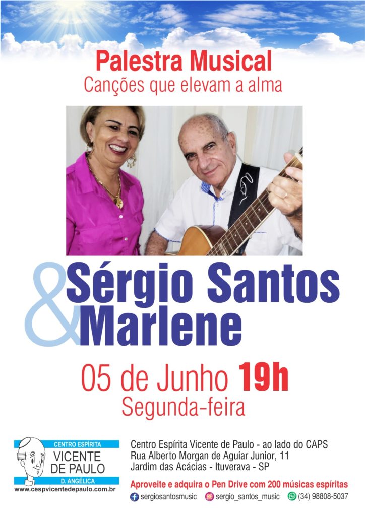 Sérgio Santos, contando com a participação especial de sua esposa Marlene, fará apresentação de uma bela palestra musical, com lindas canções para elevar nossas almas.